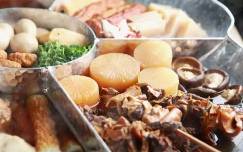 薩摩産本鰹、土佐産目近、北海道産利尻昆布をじっくりと煮出し、香り豊かで上品な味わいのおでん出汁に仕上がっている。特におすすめは、牛のアキレス腱の部分。コラーゲンたっぷりで、ぷるぷるの柔らかい食感が女性にうれしい。