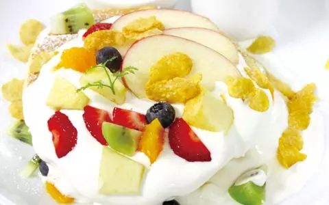 季節のフルーツと、北海道産生乳ソフトクリームのコラボレーション!女性の心をくすぐる粉糖がふりかけられている。ぜひ、自慢の有機アイスコーヒーと一緒に召し上がれ。