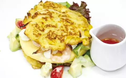 スイートコーンとゴボウ入りのかき揚げ風ハッシュドブラウンと、海老・アボカド・モッツァレラ・トマトをパンケーキでサンド。ディナータイムに、チリのオーガニックワインと一緒にいただく女性が急増中だとか。