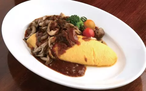 オムレツを秋の味覚たっぷりソースで「牛すじ煮込みといろいろ木の子のデミグラスソースオムレツ!」¥1,050
