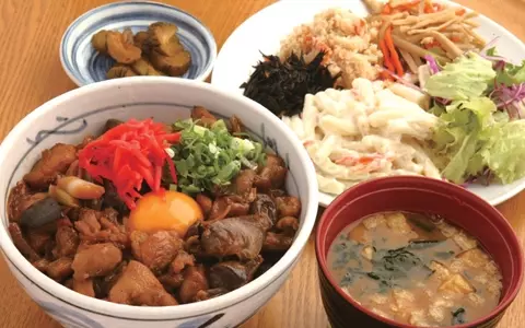鶏もつが女性に大人気!「惣菜ビュッフェ付きランチ!焼き鶏もつ丼定食」¥700
