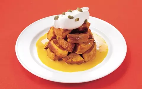 丘のように高く積みあがったカボチャ風味のフレンチトースト。トーストの中にはバニラアイスが隠れている。
