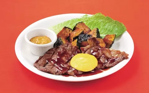 ベースボールカフェ特製ステーキに、パンプキンアレジンを加えた一品。ピリッとスパイスが効いたソースに付け合わせの甘いカボチャがよく合う。