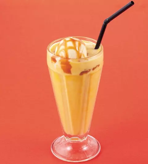 バニラアイスとキャラメルソースがアクセントの、栄養たっぷりのかぼちゃを使った甘さ控えめシェイク。