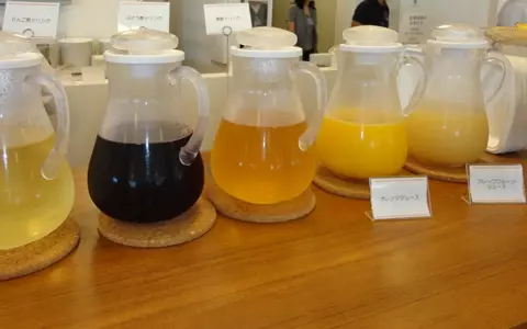 見本通りに料理をとっていくと、ご覧の通り、野菜・魚介類・たんぱく質など、バランスを考えた食材で作られたランチプレートの出来上がり。代官山あたりのカフェでいただいたら、軽く¥1,500くらいはいくであろうおしゃれなプレートも、社員食堂なのでもちろん無料。また、りんご酢・ぶどう酢なども並ぶ、ドリンクメニューは、特に女性社員に人気だとか。