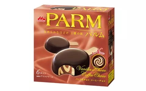 バニラアイスクリームとチョコアイスクリームをうずまき状にし、コーヒーチョコでコーティングした「PARM(パルム)バニラ&チョコandコーヒーチョコ」。なめらかなバニラアイスクリーム、ほろ苦いチョコレートアイスクリーム、苦味の効いたコーヒーチョコが混ざり合う、複合的な味が一本で楽しめる。