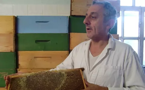 養蜂農家のワルター氏。化学肥料など使用していない環境の花から蜂が蜜を採取し、加熱せずに作られるため、オーガニックの植物のパワーが凝縮されている。