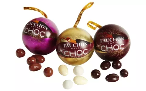 直径7センチのボール状のおいしいオーナメント『クリスマスボール』。フォションカラーの3種のボールの中にはチョコレートコーティングされたそれぞれに異なる風味のアーモンド、ヘーゼルナッツやシリアルが入っている。