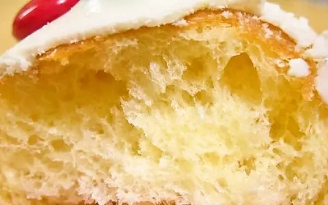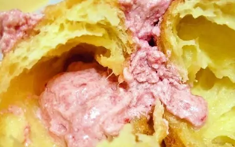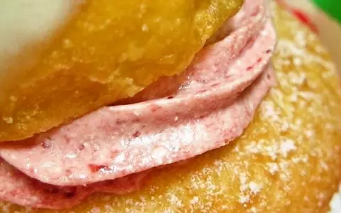 そして下の胴体部はシュー生地。こちらはふわふわ軽い食感。中にはストロベリーホイップが入っており、イチゴシュークリームの感覚で食べる事ができる。見た目がかわいいだけでなく、2つのドーナツ生地が楽しめるなかなか凝ったドーナツであった。