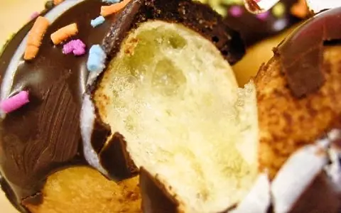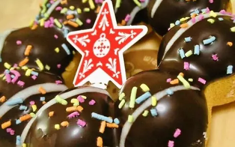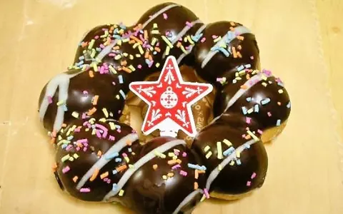 ポン・デ・リングの生地の半分がチョコレートでコーティングされ、更に砂糖でカラフルにデコレーションすることでクリスマスリースの賑やかな感じを表している。