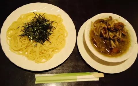 品川生まれ品川育ちのオーナーが、「品川宿」という独創的つけ麺パスタを開発。あさりと海苔の醤油ベースのつけ汁にパスタをつけて食す。 麺を全部頂いた後には、そば湯ならぬ「スパゲッティー湯」(ゆで湯)をつけ汁に注いで頂こう。