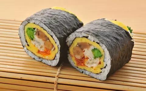 六緑の恵方巻きは、蟹や菜の花など季節を感じる食材を崩れにくいように薄焼き卵で巻いた、職人の技が光る逸品。