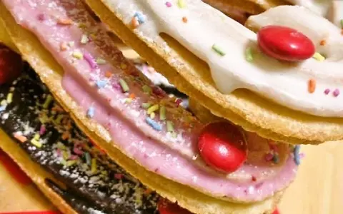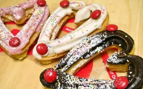 チュロの基本のデコレーションは、真っ赤な粒チョコが3つに、テンションが上がるカラーシュガーがたっぷり降りかかっている。3つそろうと見た目がとても華やかだ。