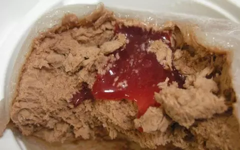 少し常温で置いておき、ほどよく餅が柔らかくなった所でぱくり。びよ~んと伸びる餅の中にはビターな甘さのチョコレートアイスが。更に中央にはとろけんばかりの真っ赤なストロベリーソースが入っている。