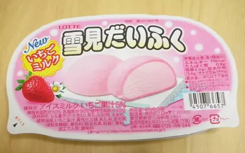 2つめは「雪見だいふく いちごミルク」。おしゃれれ大人感漂うストロベリーショコラに対して、こちらは女子受けしそうなピンクでかわいいパッケージ。