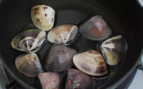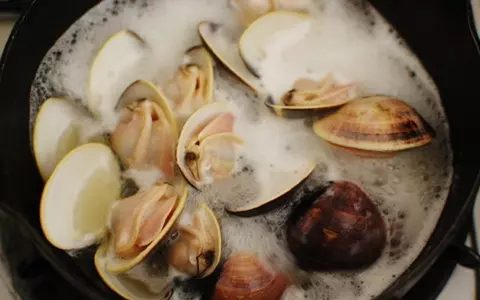 3.その間に、鍋にハマグリをいれて中火にかけ、白ワインを入れる。蓋をして、ハマグリの口が開くまで1~2分弱火で蒸し煮にする。