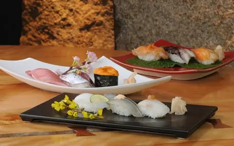 期待を裏切らない職人の技を披露してくれる、江戸前寿司「六緑」(ろくろく)では、瀬戸内海の旬の魚と、色鮮やかな春野菜を織り交ぜた寿司懐石が楽しめる。日本酒との相性も抜群だ。