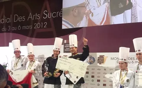 六本木のグランド ハイアット 東京のペストリー副料理長 岡崎正輝氏と、吉祥寺の「パティスリーアテスウェイ」の芋生玲子氏が、2012年3月3日(土)~6日(火)に開催された男女混合チームによる国際製菓コンクール『ル・モンディアル・デ・ザール・シュクレ2012』に日本代表として出場し、強豪スイス(2位)、フランス(3位)をおさえ、見事世界一に輝いた。