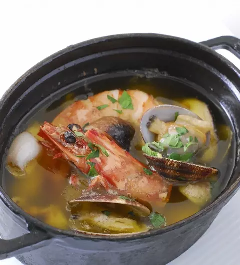 アツアツのオリーブオイルで魚介ときのこを煮込んだ、スペインの家庭料理。オリーブオイルの風味をディナータイムにぜひ、お楽しみあれ。