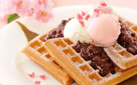 渋みを残した濃厚な味わいの抹茶アイスと、ホイップクリームをON。さらに栗、黒豆、国産あずきをたっぷりトッピングし、最後に黒蜜ときなこで仕上げた、和スイーツの魅力をつめこんだ、うららかな春のひとときにふさわしい上品なワッフル。