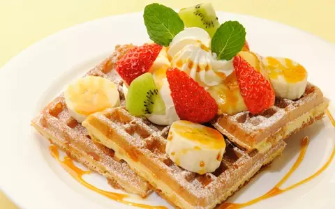 オリジナルのカスタードクリームとバニラアイス、ホイップクリームをのせ、バナナ、イチゴ、キウイをたっぷりとトッピングし、仕上げには、自家製のカラメルソースを。オリジナルカスタードの優しい甘さと、自家製カラメルソースのほろ苦さが絶妙にマッチした春らしいワッフル。カラフルにちりばめられたフルーツが華やいだ気分を盛り上げてくれる。