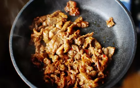 6.その上に綺麗に2.のナムルと4.の炒めた牛肉を順に敷き詰める。