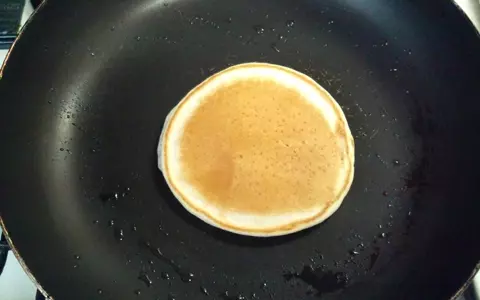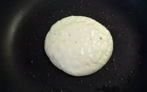 作り方1.パンケーキを焼きます。生地をフライパンの少し上から落とし、表面に空気の穴ができるまで2分ぐらい焼く。