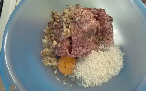 3.ハンバーグを作ります。ボールに合挽き肉、卵、パン粉、塩、コショウ、炒めたタマネギを入れて、全体的にしっかりと混ぜる。混ぜる時はヘラなどの道具を使ってもOK。