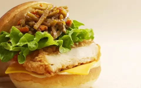 「足柄まさカリーチーズチキンバーガー」は、以前好評だった「絶品足柄まさカリービーフバーガー」のチキンバージョンで、足柄地方の“金太郎”の象徴「マサカリ」と金太郎の子供であるきんぴらに由来する「きんぴらごぼう」を味わい深いカレー味に仕上げ、香味野菜のしょうがやにんにくの風味豊かな和風のフライドチキンパティとカレーとの相性が良いチーズを合わせたもの。