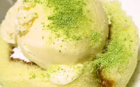 まず最初にロールケーキを好きな厚さに切ったらほんの少しレンジでチン。その上にスプーンですくったバニラアイスをのせ、彩りに抹茶ラテの粉をぱらっとふりかける。