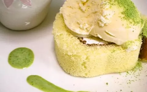 続いてバニラアイスを少量とかしてそこに抹茶ラテの粉を混ぜ抹茶ソースを作成。お皿にスプーンで模様を描くようにしてロールケーキに添える。