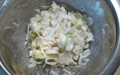 2.解凍している間に、ネギチーズの具材を下準備する。長ネギは細かい輪切りにしサイコロチーズを混ぜる。塩、コショウ、マヨネーズで味付けする。