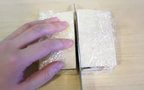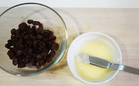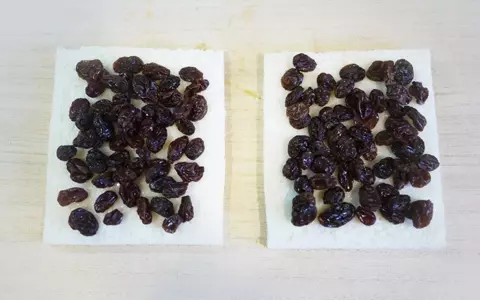 8.パンに7のシュガーバターを塗り、レーズンをのせます。あとは同様に挟んでラップで包み、重しをします。