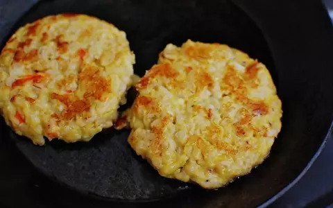 5.冷えた4を好きな大きさにまとめ、オリーブオイル(分量外)を熱したフライパンで両面こんがり焼く。
