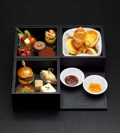 ブルガリ アフタヌーンティ・ボックス \4,000(消費税込み・サービス料10%別)14種類のフィンガーフードやドルチェが詰められた、大人のための贅沢なお楽しみ。キリッと冷えたイタリア産白ワインやプロセッコとともに味わって。