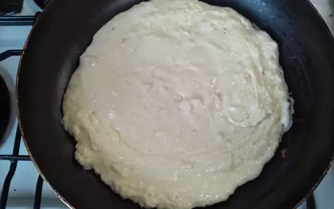 ▼さらに厚さを求めておたま3杯分をフライパンに流し込むと、生地が流れてしまう。面積が大きい分、火の通りが悪い。ひっくり返すのに一苦労。