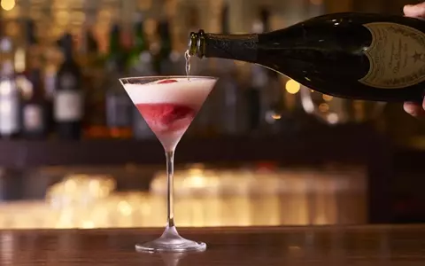 光輝く黄金色、最高級シャンパンの代名詞ドン・ペリニヨンと、旬のフルーツをつかったソルベの相性が抜群なドンペリソルベを楽しめるのは、ガラスのワインセラーに囲まれたスタイリッシュな空間 「オーク ドア バー」。