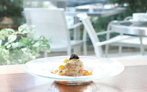 イタリアン カフェ「フィオレンティーナ」で毎年好評の冷製パスタ。今年はウニ、キャビアを贅沢につかった海の幸の冷製カルボナーラが登場。