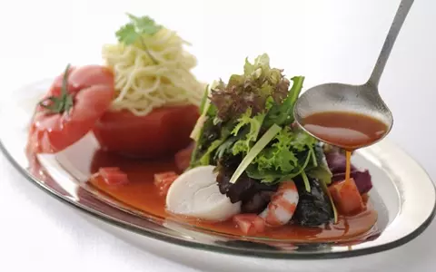美肌のオーガニックトマトスープ冷麺 海鮮入りサラダ添え~海洋性コラーゲン麺~ ¥1,600(中国料理「チャイナルーム」
