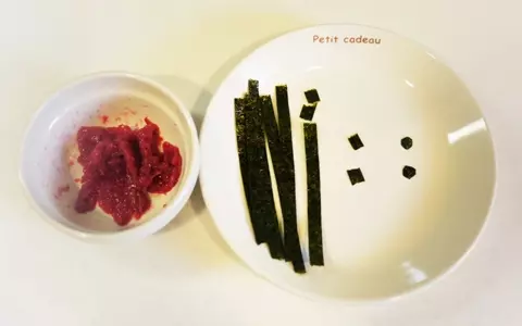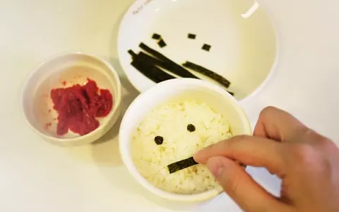 梅干しは種を取り、適当に細かくしておこう。海苔は5mm幅くらいになるようにキッチンばさみで細長く切る。そこから正方形になるように小さく切り、角をかるく落とすように切ると目のパーツの完成。きっちりした形でなくても大丈夫。