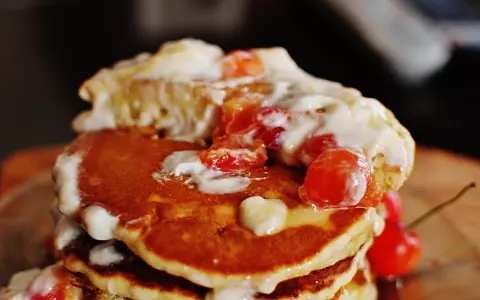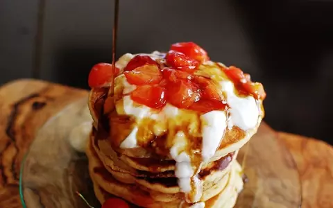 ヨーグルトをたっぷり使って超シットリしたパンケーキに甘酸っぱいさくらんぼがジューシーに口いっぱいに広がる。