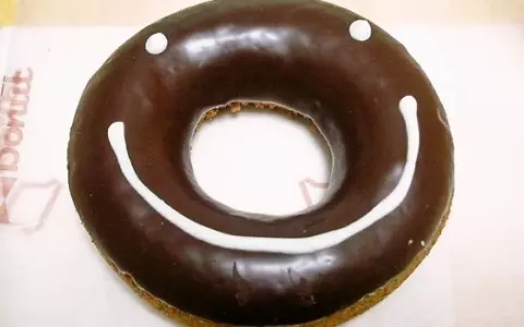 これの見どころは何と言ってもにっこり笑顔のデコレーション。夏の暑さに負けない元気が湧いてくる。こちらも生姜のドーナツ生地。上半分にチョコレートがコーティングされている。