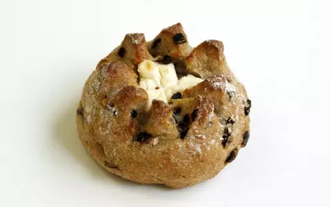 フランス産クリームチーズをカレンズ入りのパンで包み焼き上げたライ麦パン。(考案:西川正見 2010年クープ・デュ・モンド個人戦において日本代表として出場)