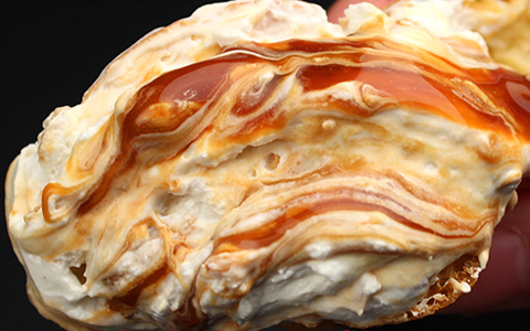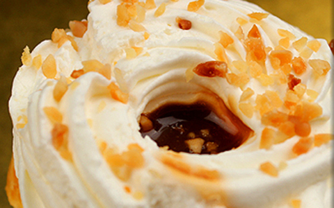 2.リッチで奥深い2層のキャラメル二口目には、この濃厚ミルククリームが引き立つキャラメルが混ざり合う。じっくりと焦がした時間を感じる、ビターなキャラメル。さらに、ほろ苦さに重なるように、生クリームをたっぷり使ったキャラメルクリームが合わさる。