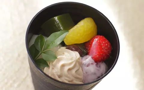 深煎りされた香り豊かな京碾きのきな粉と小豆のシャンティ、甘夏、苺、寒天、求肥、かのこ豆、小豆ムース、黒蜜ソースと、あんみつの定番の素材に、パフェの要素を盛り込んだボリューム感のある夏限定のデザート。