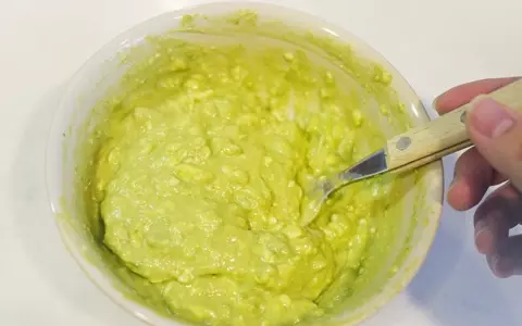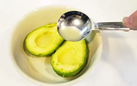 4.アボカドの変色を防ぐため、すぐにレモン汁を回しかけます。レモン汁の量はお好みです。アボカドの風味を生かしたいなら少量、チーズケーキのような爽やかな風味にしたい場合は大さじ1杯まで加えます。