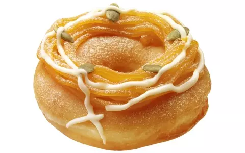 ●パンプキン クリーム トリートかぼちゃの味わい豊かなパンプキンクリームをのせたリング形ドーナツに、ローストパンプキンシードとメープルパウダーをトッピング。仕上げにあしらったホワイトチョコレートのやさしい甘さが、かぼちゃのおいしさを一層引き立てる。