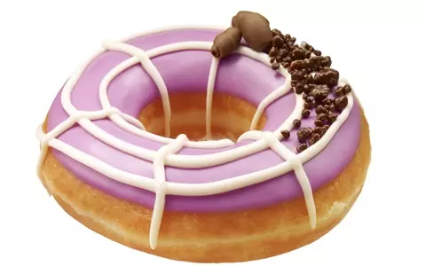 ●ムラサキイモ☆スパイダーリング形ドーナツに紫いものチョコレートをコーティング。その上にはホワイトチョコレートでくもの巣が描かれている。仕上げに、クルッと巻いたチョコレートと口の中でパチパチとはじけるキャンディチョコをちりばめて。ちょっと驚く食感が、遊び心溢れるドーナツ。