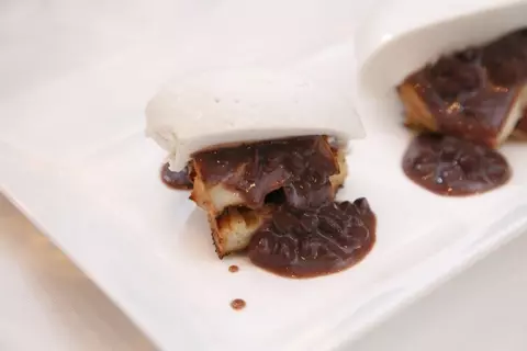 デザートの車麩の小豆スープ仕立て。車麩をフレンチトーストにし、下に「ラカントS」で炊いた小豆を豆乳でのばし、スープにしたもの。