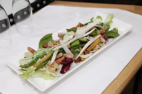 野菜の上にアスパラやベーコンのソテーをのせ、「おいしくごはん」をドレッシング状にしたソースをかけたサラダ。